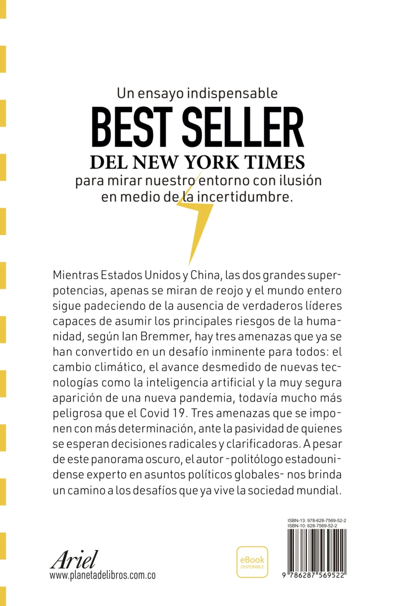 Politólogo estadounidense con 11 libros publicados, dos de ellos en el top de la lista de los más vendidos del New York Times; de esos dos, uno es justamente el que usted tiene en sus manos. Bremmer es experto en asuntos políticos globales y es fundador de Eurasia Group, compañía que analiza y valora riesgos políticos, con oficinas en las principales ciudades del mundo. Ha sido profesor de la Universidad de Nueva York, de la Universidad de Columbia; y también columnista de Time y del Financial Times.