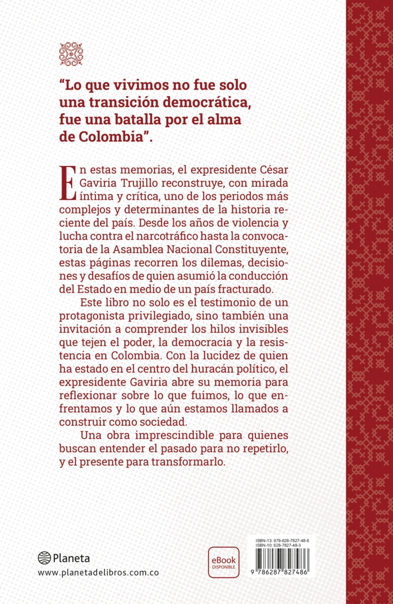 En estas memorias, el expresidente César Gaviria Trujillo reconstruye, con mirada íntima y crítica, uno de los periodos más complejos y determinantes de la historia reciente del país. Desde los años de violencia y lucha contra el narcotráfico hasta la convocatoria de la Asamblea Nacional Constituyente, estas...