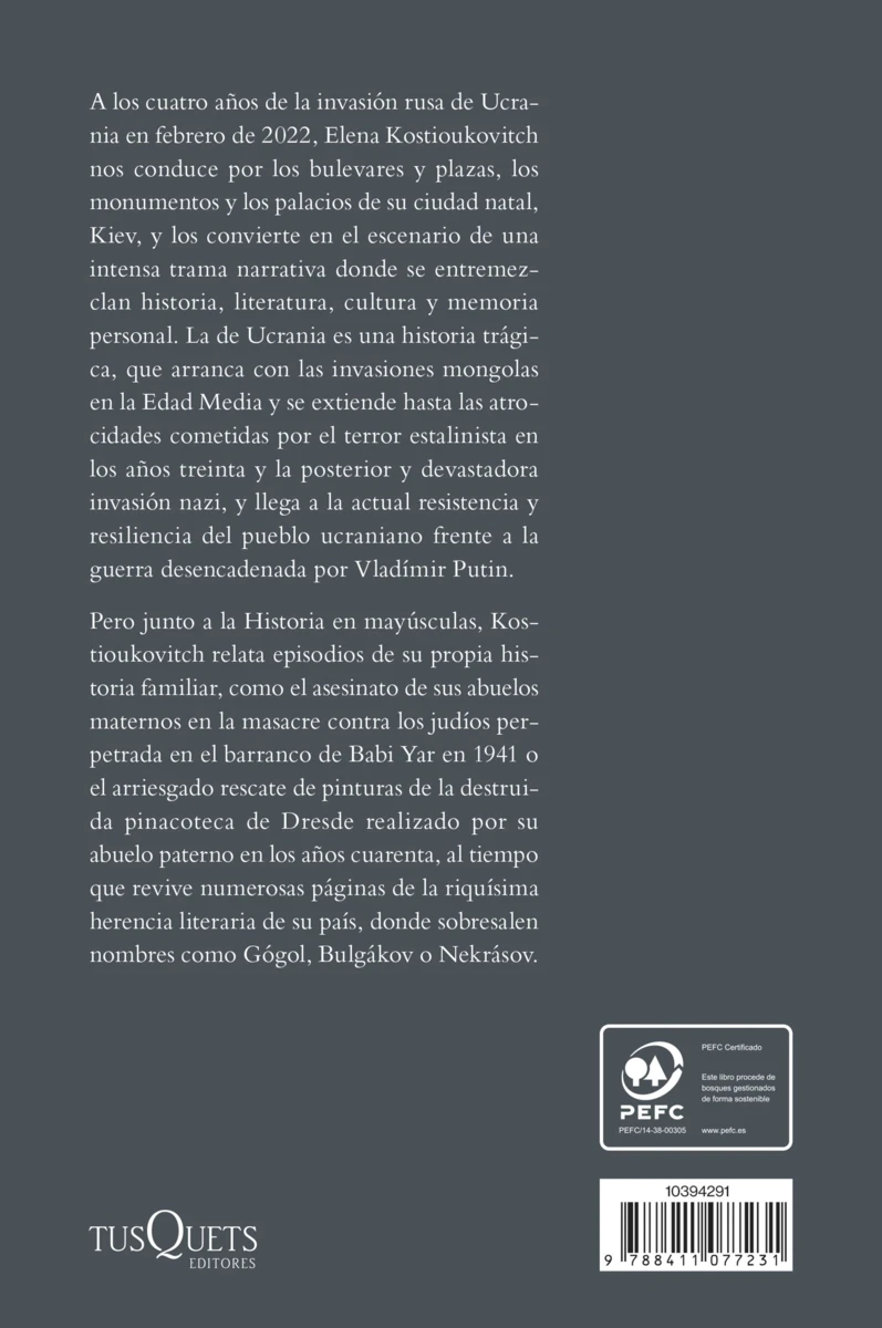 A los tres años de la invasión rusa de Ucrania de febrero de 2022, Elena Kostioukovitch nos conduce por los bulevares y plazas, los monumentos y los palacios de su ciudad natal, Kiev, y los convierte en el escenario de una intensa trama narrativa donde se...