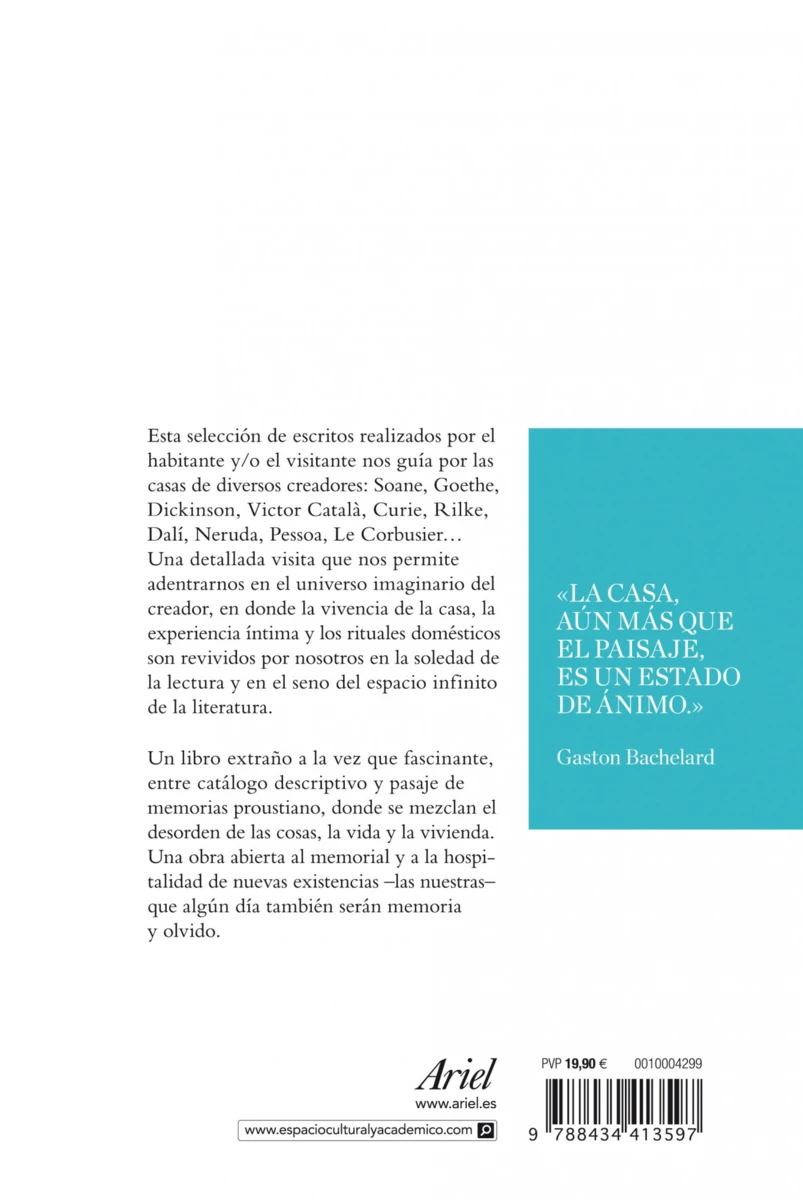 Esta selección de escritos realizados por el habitante y/o el visitante nos guía por las casas de diversos creadores: Soane, Goethe, Dickinson, Victor Català, Curie, Rilke, Dalí, Neruda, Pessoa, Le Corbusier… Una detallada visita que nos permite adentrarnos en el universo imaginario del creador, en donde la vivencia de la casa, la experiencia íntima y los rituales domésticos son revividos...