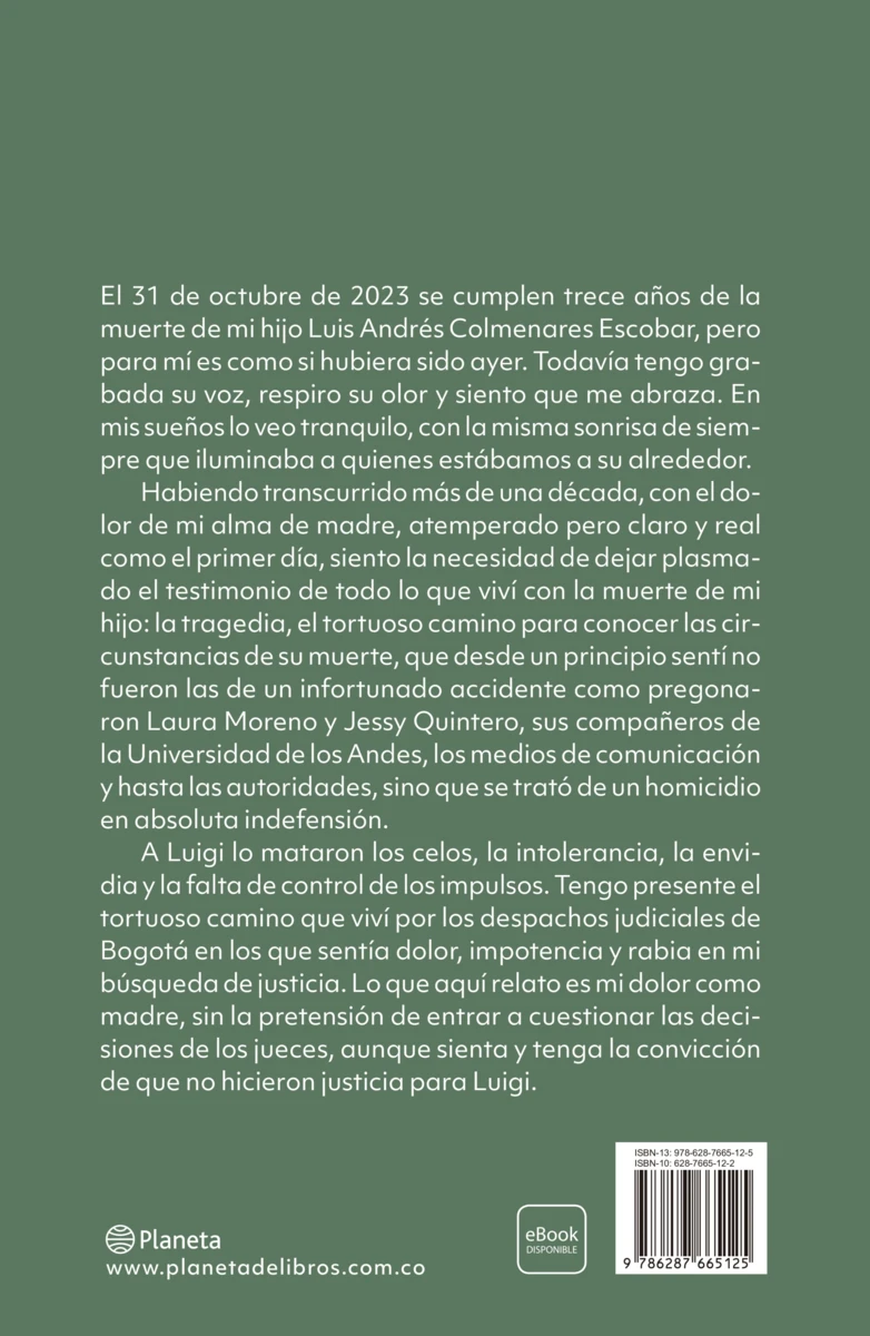 "El 31 de octubre de 2023 se cumplen trece años de la muerte de mi hijo Luis Andrés Colmenares Escobar, pero para mí es como si hubiera sido ayer. Todavía tengo grabada su voz, respiro su olor y siento que me abraza. En mis sueños lo veo tranquilo, con la misma sonrisa de siempre que iluminaba a quienes estábamos a su alrededor", tomada del prólogo de la autora