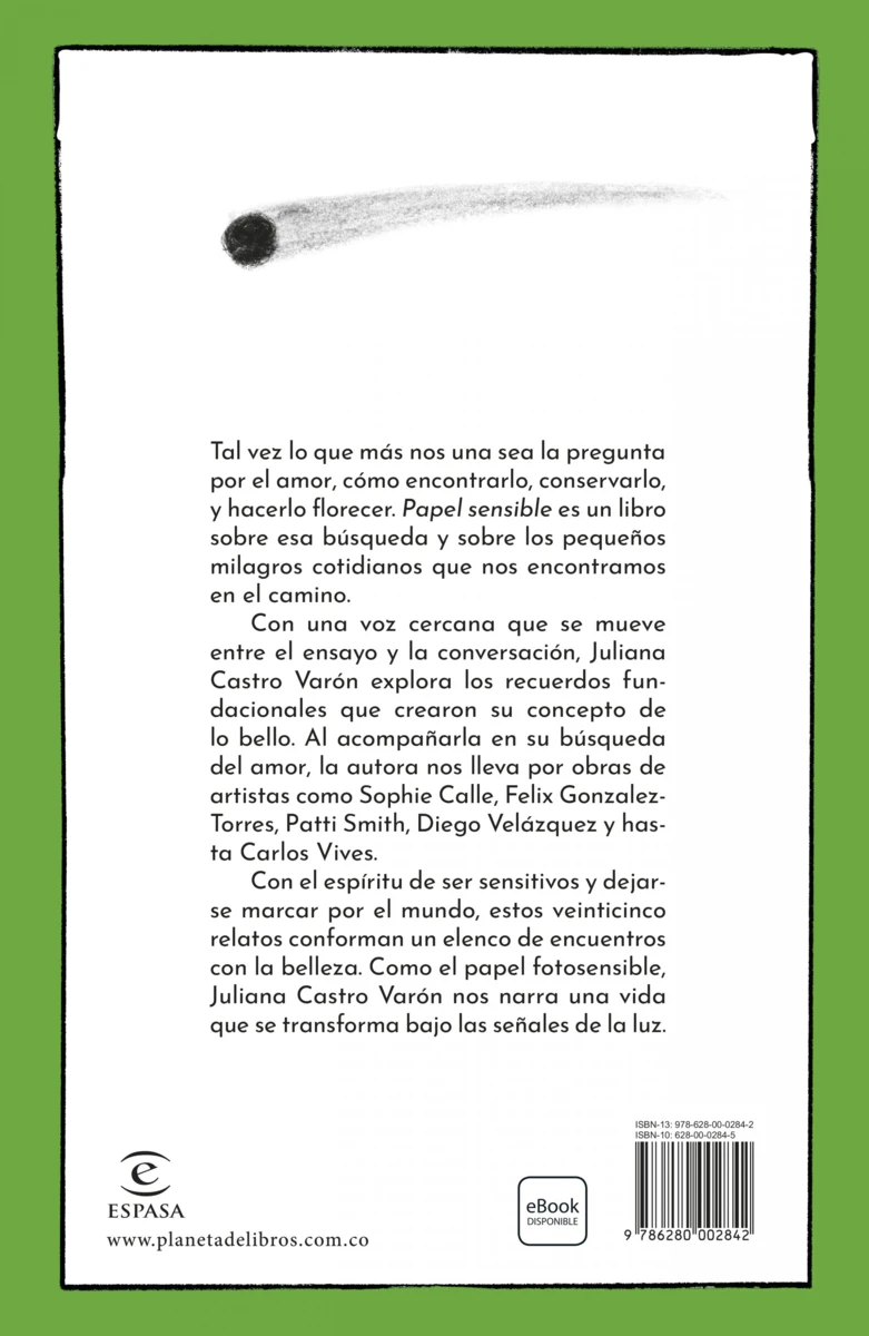 Con una voz cercana que se mueve entre el ensayo y la conversación, Juliana Castro Varón explora los recuerdos fundacionales que crearon su concepto de lo bello. Al acompañarla en su búsqueda del amor, la autora nos lleva por obras de artistas como Sophie Calle, Felix Gonzalez-Torres, Patti Smith, Diego Velázquez y hasta Carlos Vives.