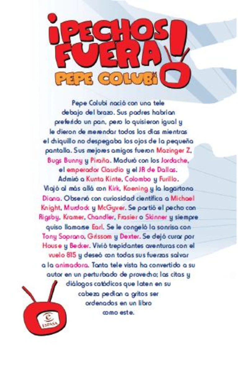 Pepe Colubi nació con una tele debajo del brazo. Sus padres habrían preferido un pan, pero lo quisieron igual y le dieron de merendar todos los días mientras el chiquillo no despegaba los ojos de la pequeña pantalla. Sus mejores amigos fueron Mazinger Z, Bugs Bunny y Piraña. Maduró con los Jordache, el emperador Claudio y el JR de Dallas....