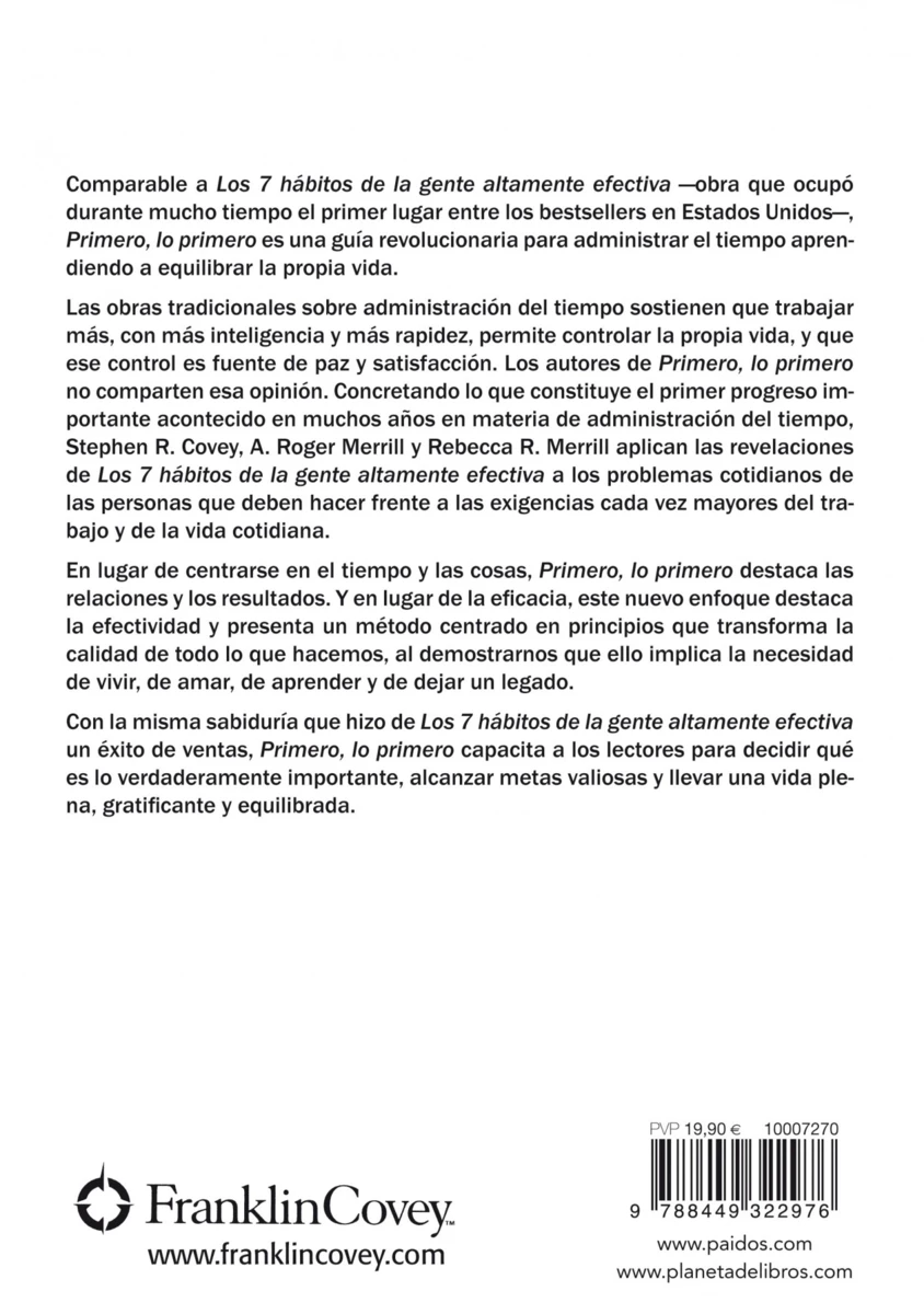 Primero, lo primero es una guía revolucionaria para administrar el tiempo aprendiendo a equilibrar la propia vida. En lugar de centrarse en el tiempo y las cosas, Primero, lo primero destaca las relaciones y los resultados. Y en lugar de la eficacia, este nuevo enfoque destaca la efectividad y presenta un método centrado en principios que transforma la calidad de todo lo que hacemos, al...